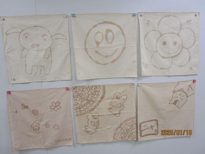 染物は、綿のハンカチに豆乳で自分の好きなデザインを描き、乾いた後に紅茶かコーヒーの染色液に浸けて染めました。コーヒーはベージュ色、紅茶はピンクっぽい色に仕上がり、完成したものを見て、自分だけのオリジナル作品に納得したり喜んだり…