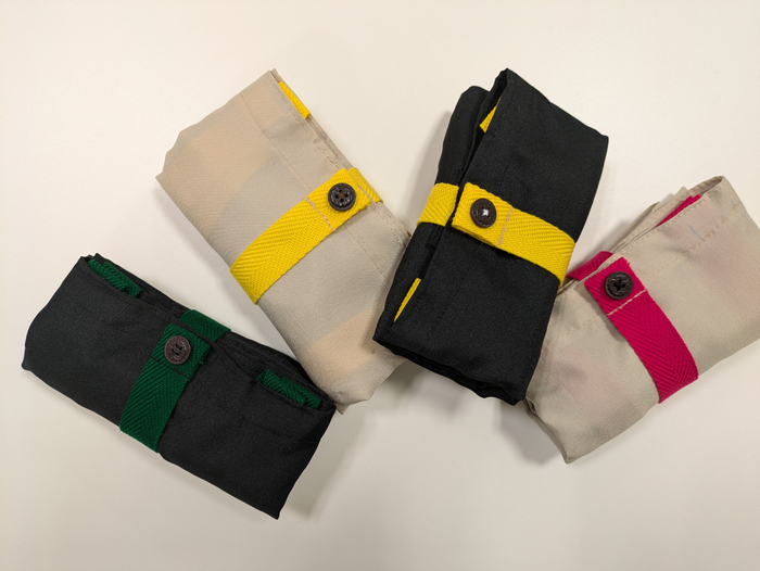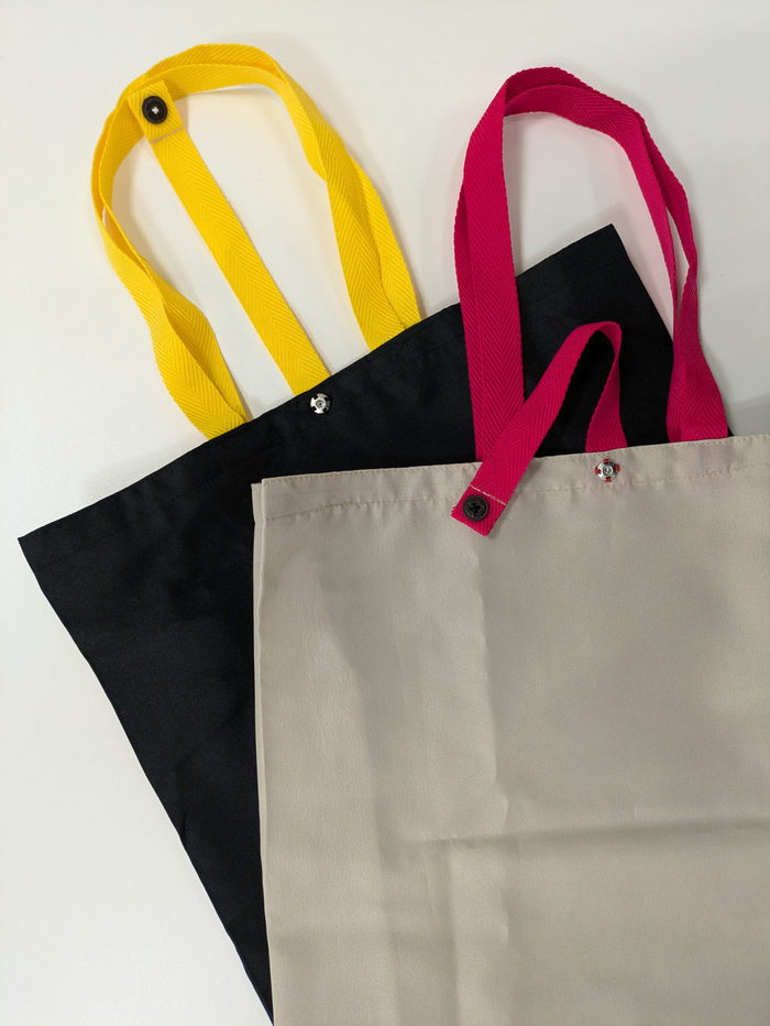 エコバッグの色はベージュと黒の2種類ですが、持ち手部分の色を各自で選び、カラフルなエコバッグができあがりました。中央に付けたひもをスナップボタンでと止めることでコンパクトにまとめることができ、持ち運びがしやすそうですね (^^♪