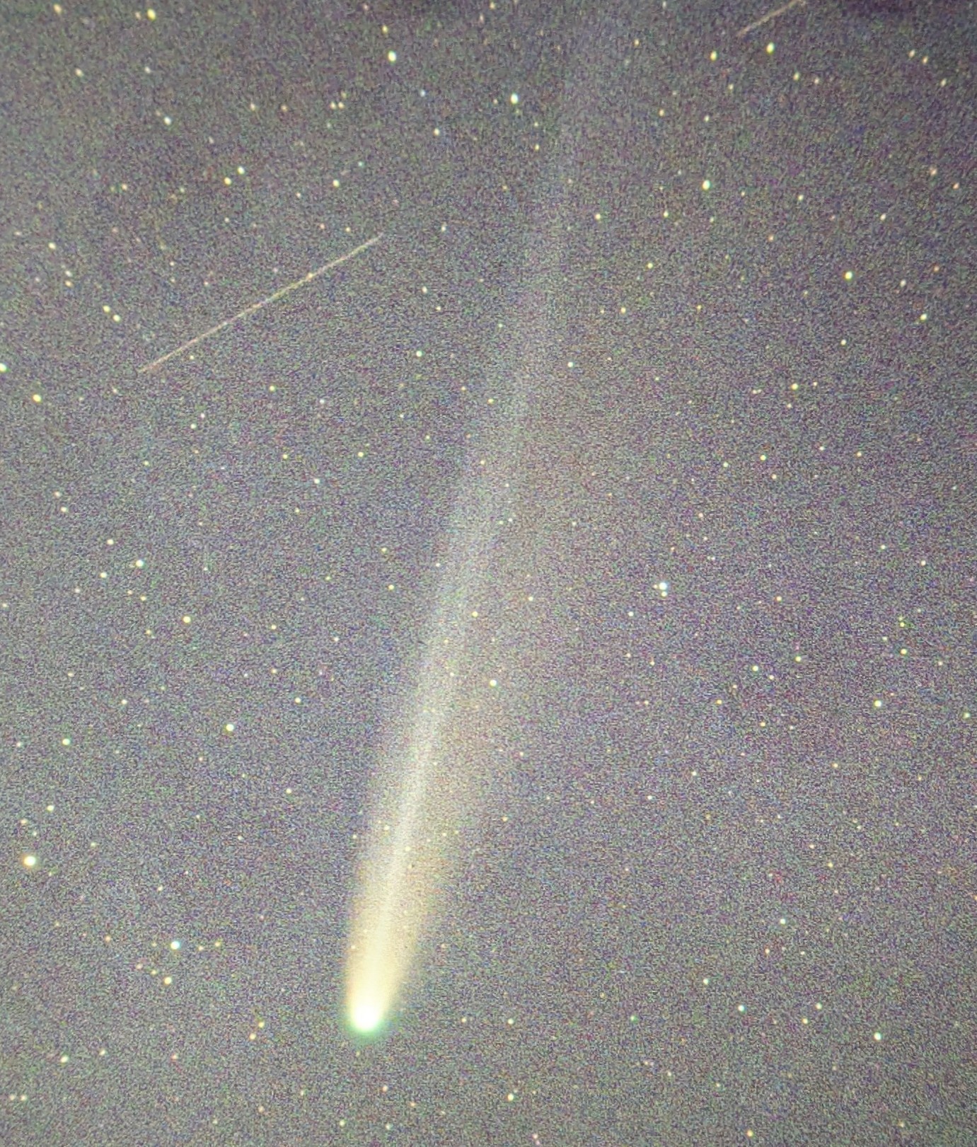 2025年12月09日(火) レモン彗星☆(少し前ですが・・) 10/27夕方18:00頃、蘭本校のある南木曽町で、理科の花井先生が撮影されました。 真上に真っすぐ伸びるイオンの尾に対して、チリの尾がやや右上に広がる様子がわかります。 レモン彗星の太陽系を回る周期は約1300年と言われていて、今は地球から遠ざかりつつあるので、 次の接近は1300年後と予想されています( ゚Д゚) その時、地球や人類はどうなっていると思いますか・・ 1300年の時の流れを想像してみてください!