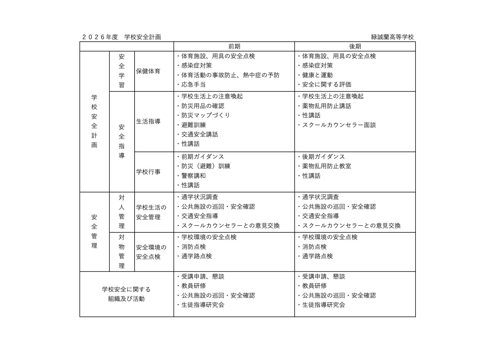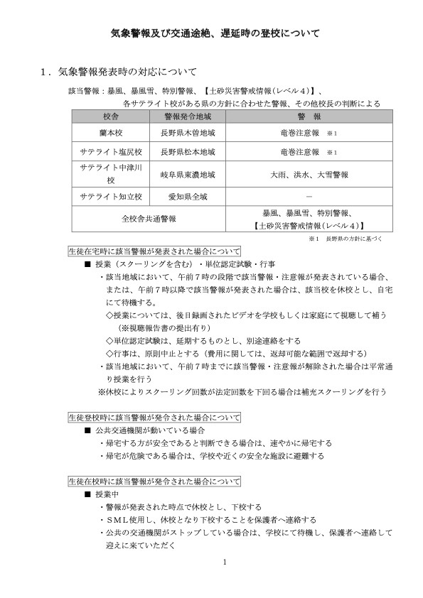 情報公開 ※ 各ファイルをクリックすると全文閲覧できます 高等学校通信教育規定第14条に基づく情報公開について 蘭本校 サテライト中津川校 サテライト知立校 ナーシング高等学院 サテライト塩尻校(※2028年廃校) 個人情報保護方針 個人情報について 2025年度学校評価 結果 学校評価まとめ 地震防災規定 地震防災規定 気象警報発令及び交通途絶、遅延等の登校について 気象警報及び著しい交通途絶等の登校 いじめ防止基本方針 いじめ防止基本方針 育友会規則 進路指導計画 2026年度 進路指導計画 学校安全計画 2026年度 学校安全計画 学校保健計画 2026年度 学校保健計画